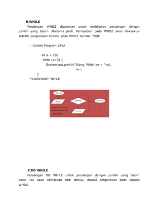 Dokumen tersebut membahas perbedaan tiga jenis perulangan dalam bahasa pemrograman Java, yaitu for, while, dan do-while. Perulangan for digunakan untuk perulangan dengan jumlah yang pasti, sedangkan while dan do-while untuk jumlah yang tidak pasti. Perbedaan utama antara while dan do-while adalah bahwa pada while pengecekan kondisi dilakukan di awal blok sedangkan pada do-while pengecekan dilakukan di akhir blok.