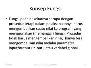 Dokumen membahas konsep dan implementasi fungsi dalam pemrograman, termasuk bagaimana fungsi mengembalikan nilai dan berbagai contoh fungsi dalam C++. Menyediakan penjelasan tentang fungsi matematis, konversi angka ke kata, dan teknik seperti call-by-value dan call-by-reference. Juga mencakup konsep fungsi rekursif dan contoh aplikasi seperti menghitung faktorial.