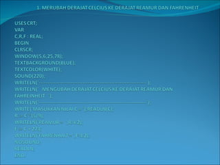 3.MENGHITUNG LUAS DAN KELILING SEGITIGA USES CRT; VAR A,B,C,K,L : REAL; BEGIN CLRSCR; WINDOW(5,5,35,70); TEXTBACKGROUND(WHITE); TEXTCOLOR(BLUE); WRITELN('---------------------------------------------------'); WRITELN(' PROGRAM MENGHITUNG LUAS DAN KELILING SEGITIGA '); WRITELN('---------------------------------------------------'); A := 17; B := 12; C := 8; WRITELN('MASUKKAN NILAI A = 17'); WRITELN('MASUKKAN NILAI B = 12'); WRITELN('MASUKKAN NILAI C = 8'); WRITELN('HASILNYA ADALAH'); K := A + B + C; GOTOXY(9,9); WRITELN('KELILING = ',K); L := (A+B)/2; GOTOXY(9,10); WRITELN('LUAS = ',L); READLN; END.
