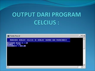 6. MENCARI NILAIBULAT DAN PECAHAN USES CRT; VAR X : REAL; BEGIN CLRSCR; WINDOW(5,7,32,70); TEXTBACKGROUND(WHITE); TEXTCOLOR(BLUE); SOUND(1000); WRITELN('-----------------------------------'); WRITELN(' MENCARI NILAI BULAT DAN PECAHAN '); WRITELN('-----------------------------------'); WRITE('MASUKKAN NILAI = '); READLN(X); GOTOXY(5,8); WRITELN('PECAHAN= ',FRAC(X):5:3); GOTOXY(5,11); WRITELN('BILANGAN BULAT = ',INT(X):5:3); NOSOUND; READLN; END.