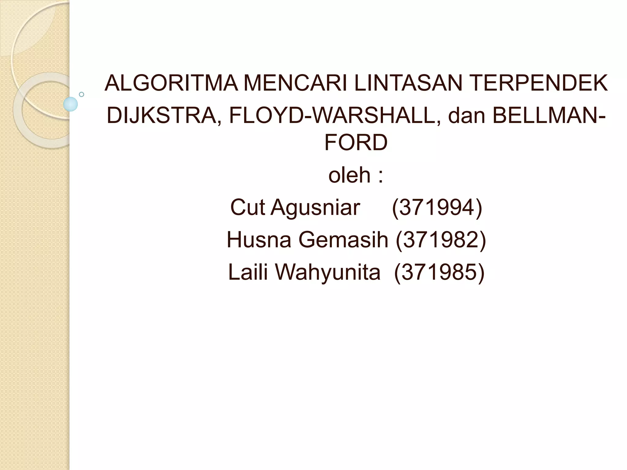 Dokumen ini membahas algoritma pencarian lintasan terpendek, yaitu Dijkstra, Floyd-Warshall, dan Bellman-Ford, mencakup pengantar, cara kerja, kompleksitas, dan studi kasus masing-masing algoritma. Dijkstra digunakan untuk graf dengan bobot positif, Floyd-Warshall untuk semua pasangan simpul, sedangkan Bellman-Ford mampu menangani graf dengan bobot negatif. Setiap algoritma memiliki kelebihan dan kekurangan tergantung pada kompleksitas dan jenis graf yang dianalisis.