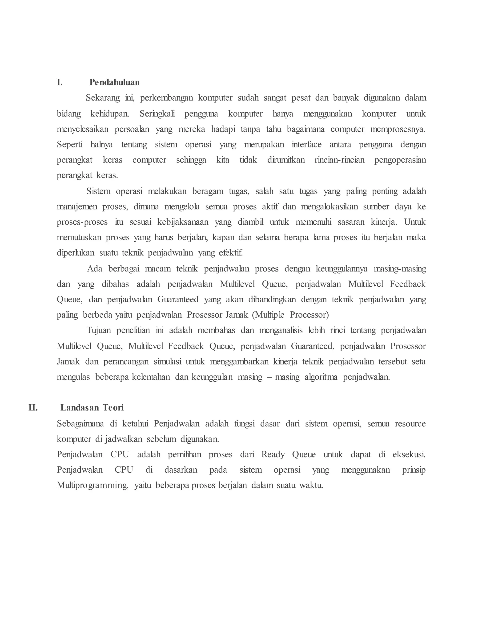 Dokumen tersebut membahas beberapa algoritma penjadwalan proses pada sistem operasi, yaitu penjadwalan Multilevel Queue, Multilevel Feedback Queue, Guaranteed, dan Multiple Processor. Algoritma-algoritma tersebut dibandingkan berdasarkan keunggulan dan kelemahan masing-masing dalam mengelola sumber daya komputer seperti CPU.