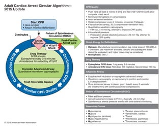 This document provides guidelines for cardiac arrest treatment in adults. It outlines the steps of cardiopulmonary resuscitation (CPR), use of an automated external defibrillator, and management of shockable versus non-shockable rhythms. Key interventions include high-quality chest compressions, use of an advanced airway with capnography, epinephrine and amiodarone administration, and treatment of reversible causes of cardiac arrest.
