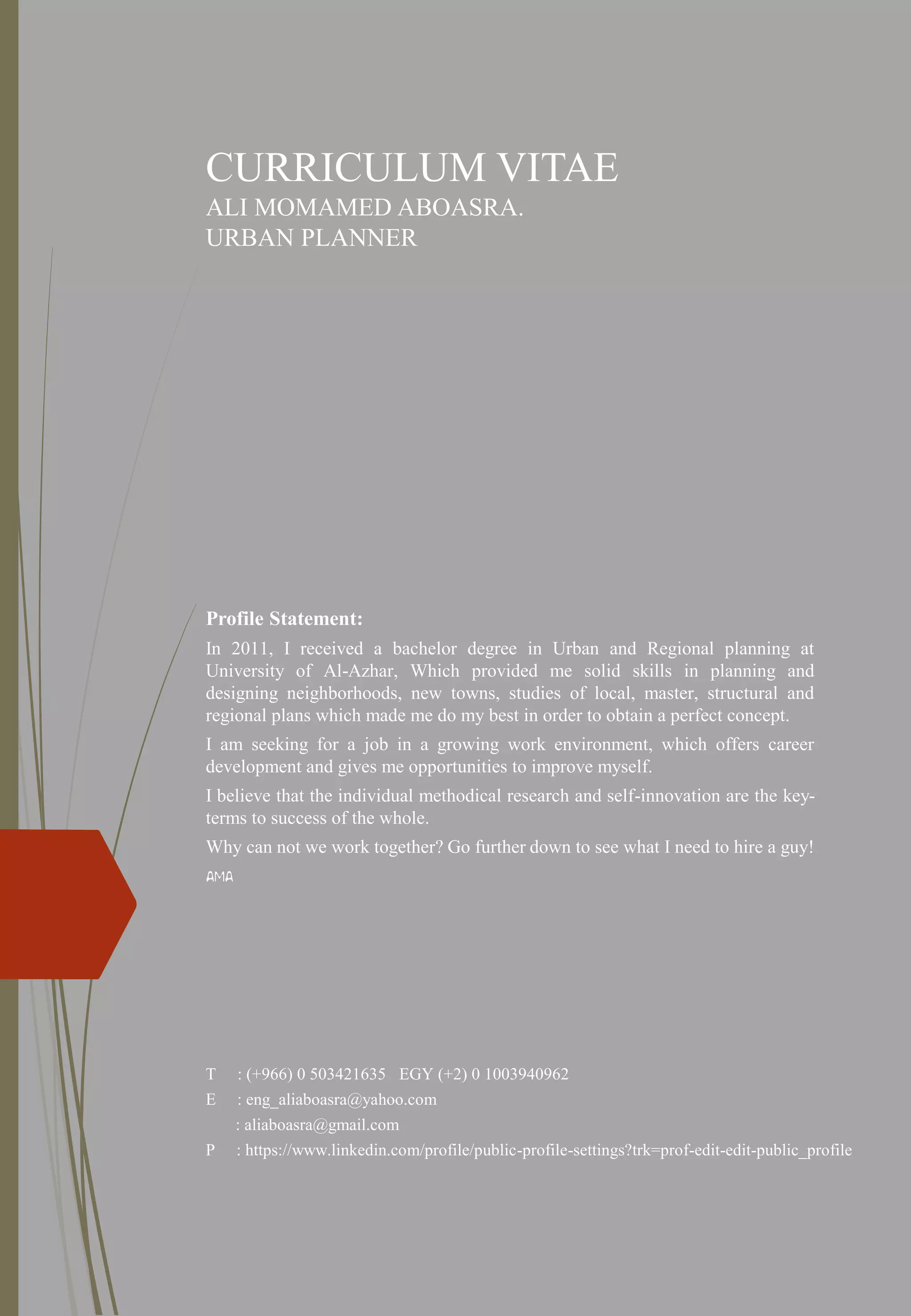 Ali Momamed Aboasra is an urban planner with a Bachelor’s degree in Urban and Regional Planning from Al-Azhar University, seeking career advancement in a dynamic environment. He possesses extensive experience in urban and regional planning, including work on comprehensive development projects and various master plans in Saudi Arabia and Egypt. Aboasra is proficient in urban design software and possesses a strong background in preparing detailed studies, reports, and strategic plans for various urban environments.