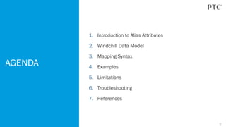 The document provides a comprehensive guide on configuring alias attributes in Windchill, detailing mapping instructions, examples, limitations, and troubleshooting steps. It discusses the significance of alias attributes in displaying related object information and offers syntax for creating these mappings. The document also highlights the tools available for identifying and managing alias attributes within the Windchill data model.