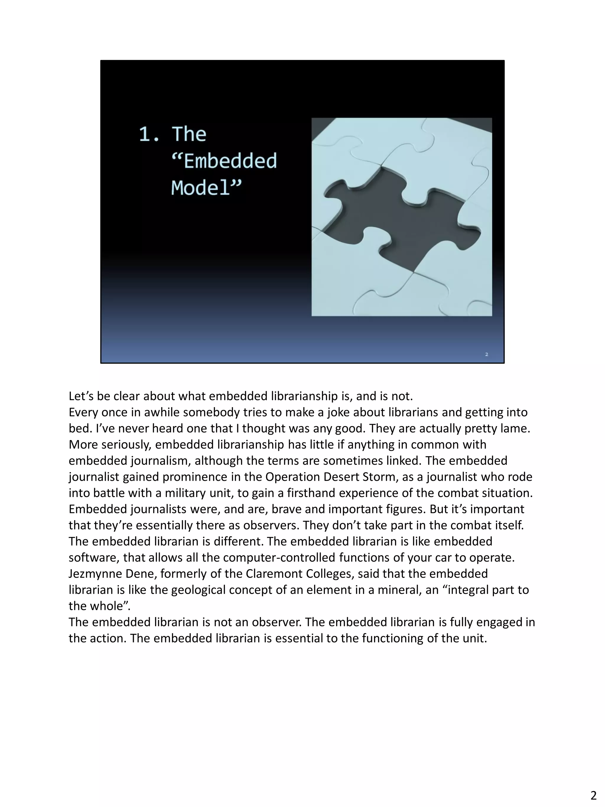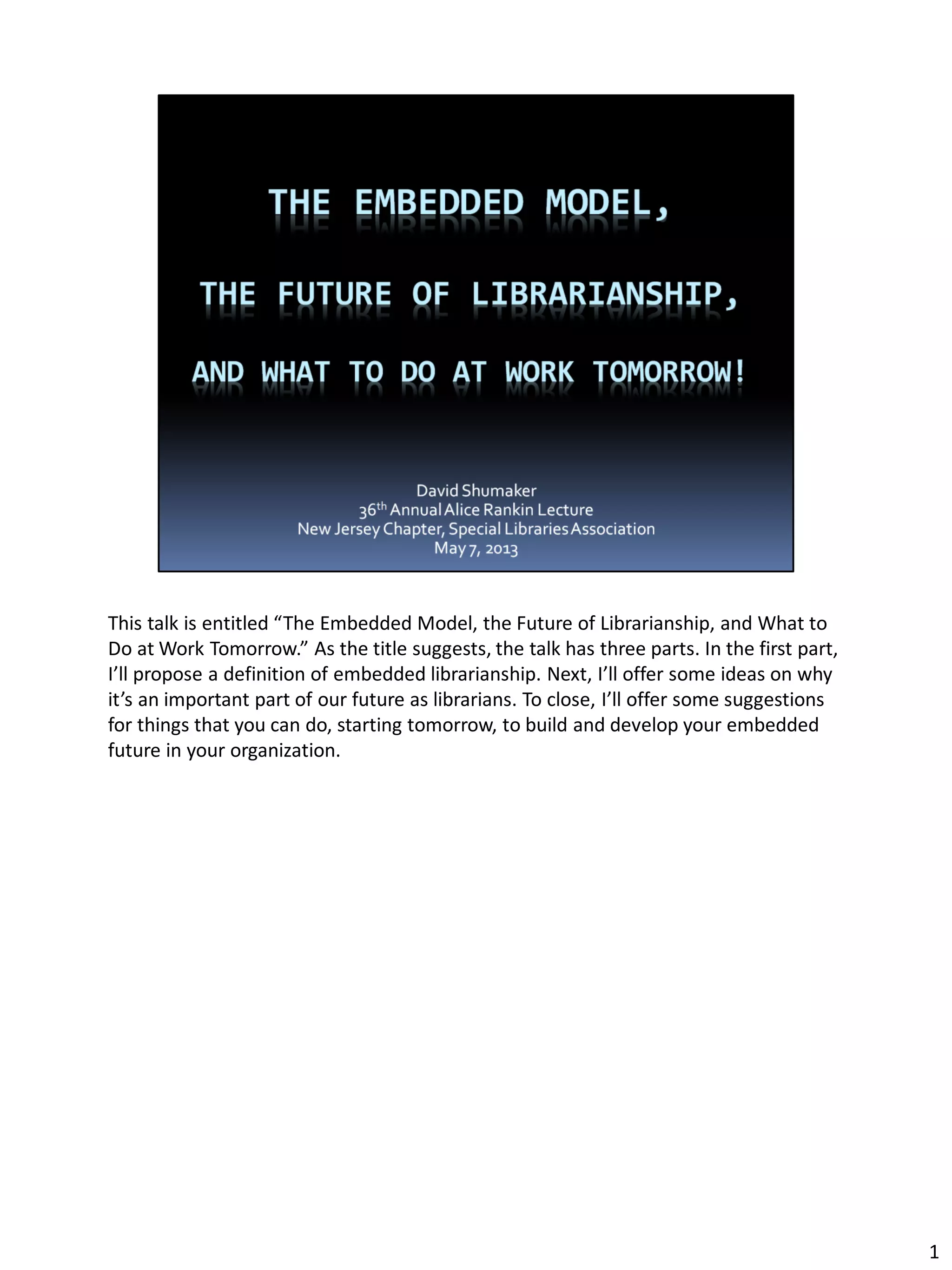 This talk discusses embedded librarianship and its importance for the future of the profession. It is divided into three parts. The first part defines embedded librarianship as developing strong relationships with teams, achieving mutual understanding of goals, sharing responsibility for achieving goals, and making customized contributions as an information expert. The second part discusses how embedded librarianship differs from traditional librarianship by focusing on relationships rather than transactions and requiring specialization within domains. The third part suggests actions librarians can take, starting with reflecting on current relationships and readiness for embedded roles, to help transition towards embedded models.