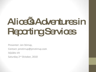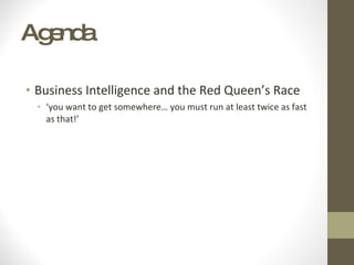 The document discusses business intelligence and visualization techniques for reporting. It covers the three stages of visual processing - pre-attentive, visual integration, and cognitive integration. Some practical suggestions are provided for visualization including using sequential palettes, highlighting data, and summarizing information before providing details on demand. The presentation aims to demonstrate how to think visually when reporting data.
