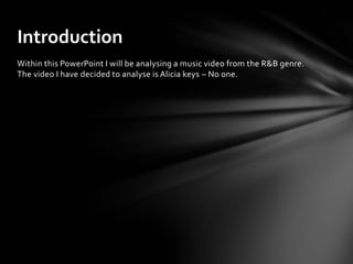 The document analyzes Alicia Keys' music video for 'No One,' highlighting its R&B elements, including the luxurious setting and typical conventions like piano playing. It notes the use of simple yet glamorous costumes and minimal props, emphasizing the artist's presence. The video primarily focuses on Keys' performance, showcasing her playing the piano in various locations without a narrative structure.