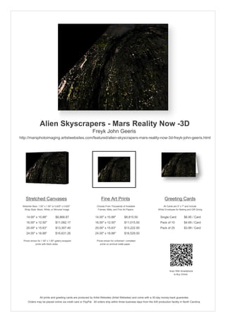 This document provides pricing information for artwork prints, stretched canvases, greeting cards, and other products featuring the image "Alien Skyscrapers - Mars Reality Now -3D" by Freyk John Geeris. Stretched canvas prints are available in various sizes from 14x11 inches to 24x19 inches, ranging in price from $8,869 to $16,631. Fine art prints on archival paper are also available in different sizes from 14x11 to 24x19 inches, priced between $8,816 to $16,530. Greeting cards featuring the image are $6.95 for a single card or discounted in packs of 10 or 25. All products are produced and shipped within three business