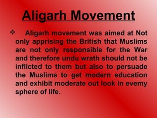 The Aligarh Movement was aimed at educating Muslims and promoting a moderate outlook. It was started by Sir Syed Ahmed Khan in response to British hostility and Hindu ascendancy after the 1857 uprising. Sir Syed realized that Muslims needed to adopt English education to progress. He established schools and colleges like the MAO College and University which helped educate Muslims and bridge the gap with other communities. The movement promoted unity between Hindus and Muslims.