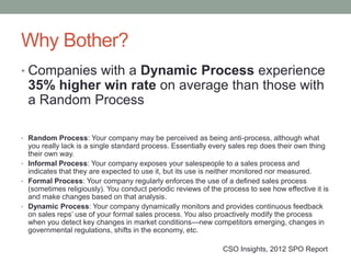 The document outlines the importance of a structured sales process, highlighting that companies with a dynamic sales approach achieve a 35% higher win rate compared to those with random processes. It details the various stages of the buying and selling processes, emphasizing the need for clear documentation, defined roles, and observable milestones. The text concludes that aligning purchasing strategies with sales tactics can not only support buyers but also simplify CRM deployment and enhance revenue projections.