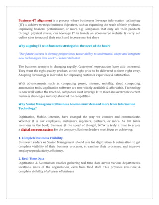 The document emphasizes the critical importance of aligning IT strategy with business strategy to drive growth and efficiency in modern enterprises. It outlines how integrating technology enhances customer experience, operational visibility, and decision-making while providing specific examples of benefits such as improved inventory management. Ultimately, it asserts that effective alignment leads to increased productivity, profitability, and competitive advantage.