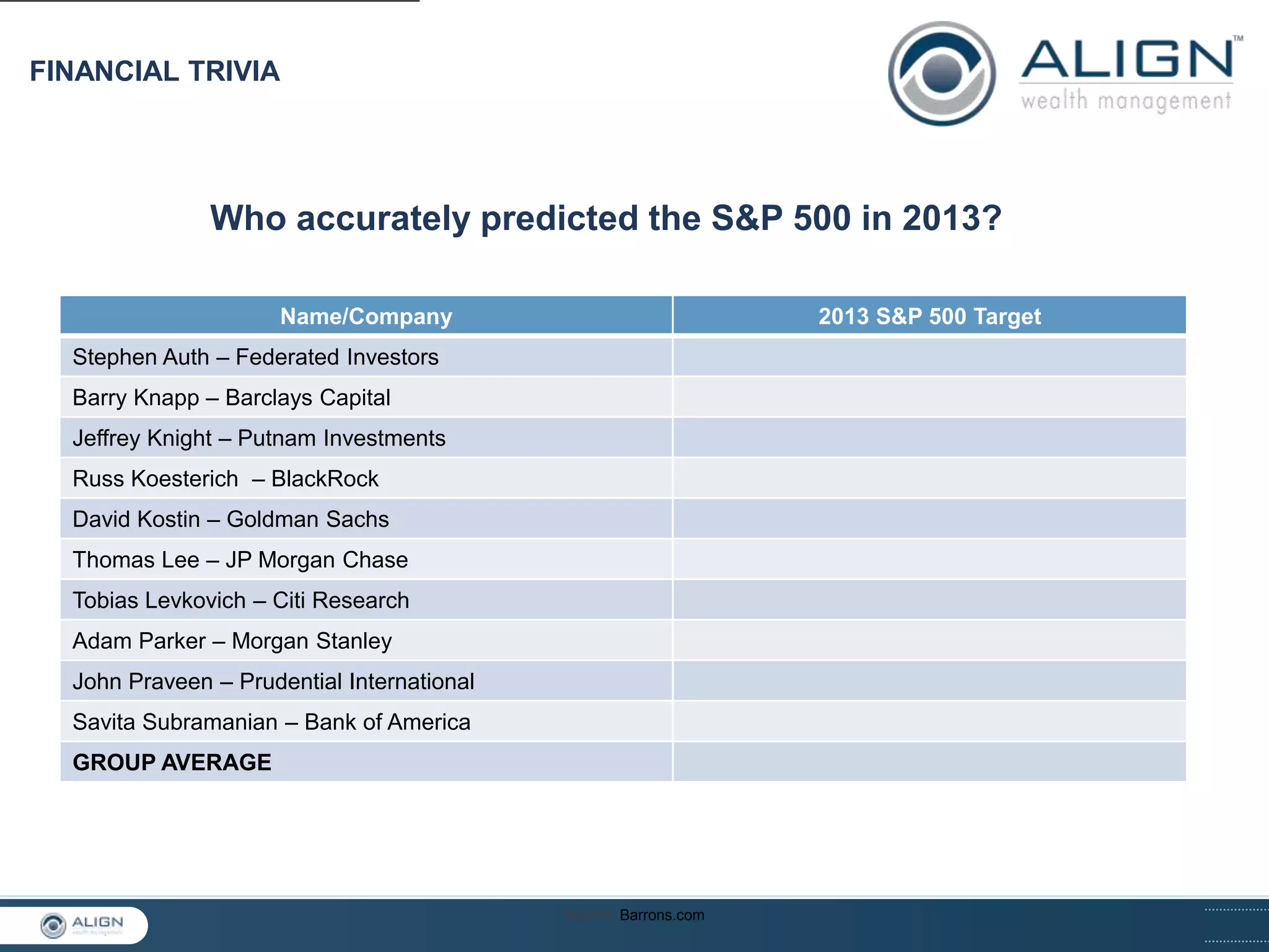 The document provides a summary of forecasts for the S&P 500 index in 2013 from various analysts and investment firms. It shows that none of the analysts accurately predicted the performance of the S&P 500, with their forecasts being off by an average of 20%. The document also includes quotes from Warren Buffett emphasizing that stock forecasting has little value and that one cannot predict movements in the stock market with accuracy.
