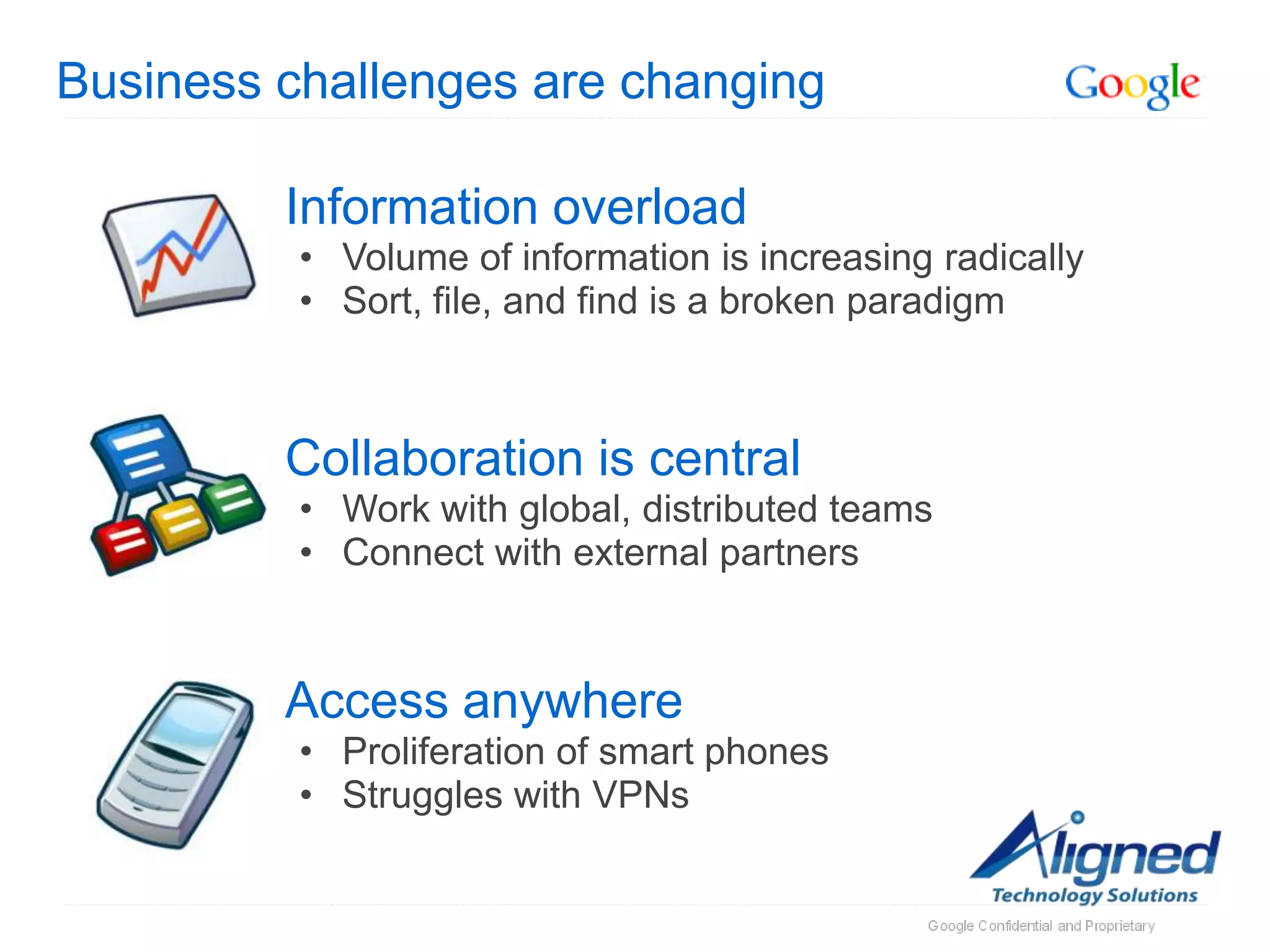Google Apps provides cloud-based productivity and collaboration tools for businesses. It offers Gmail with large storage quotas and search capabilities, instant messaging and video chat through Talk, group collaboration features through Groups, shared calendars through Calendar, document editing and sharing through Docs, website creation through Sites, and video uploading and sharing through Video. Google Apps aims to address challenges around information overload, the need for collaboration, and access from any device. It provides frequent updates, easy management, and access on mobile devices. Over 3 million businesses now use Google Apps.