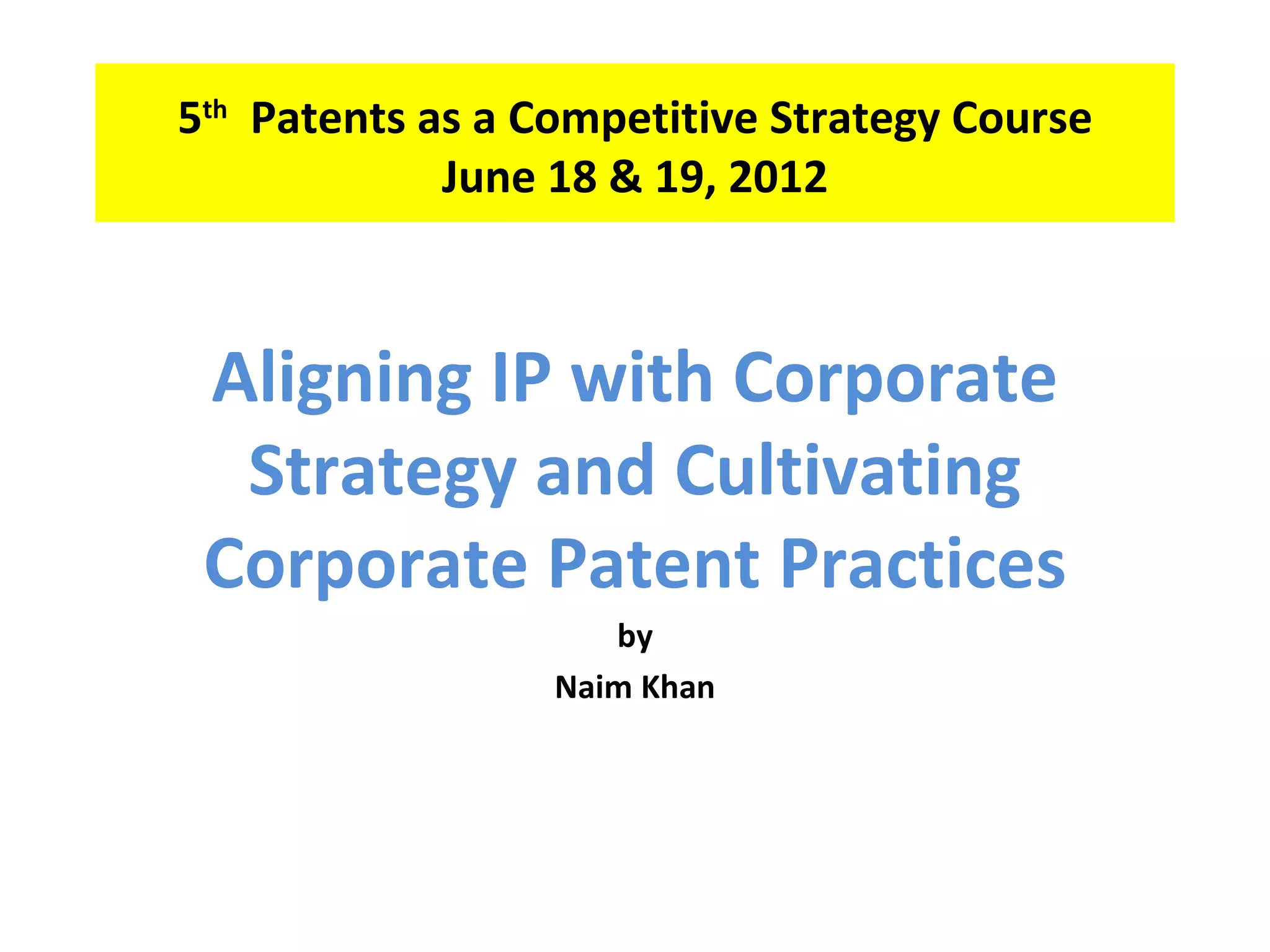 This document outlines a presentation on aligning intellectual property with corporate strategy and developing corporate patent practices. It discusses screening corporate objectives to define IP objectives, incorporating freedom to operate considerations, creating and managing ideas, and connecting an IP strategy to a strategic technology map and market scenarios to anticipate the future. The overall message is that a strong IP strategy is essential for businesses to navigate risks and maintain competitive advantages.
