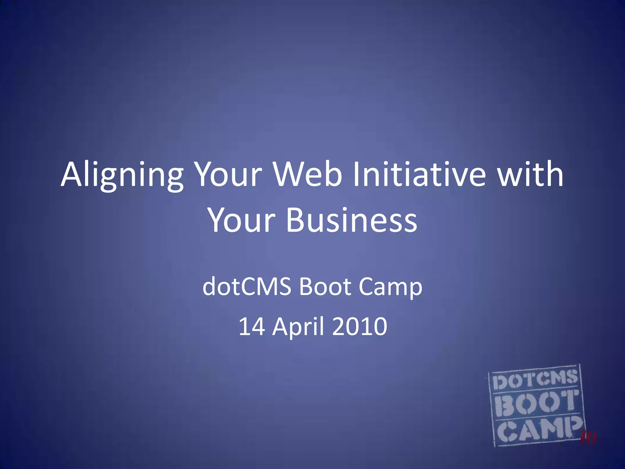 The document discusses the importance of aligning web initiatives with business goals, emphasizing the roles websites play in lead generation, education, and sales. It outlines steps for achieving (re)alignment, including gaining business unit input, assembling a web team structure, and linking web and business metrics. The document also highlights common causes of misalignment, such as poor communication and operational disconnects.