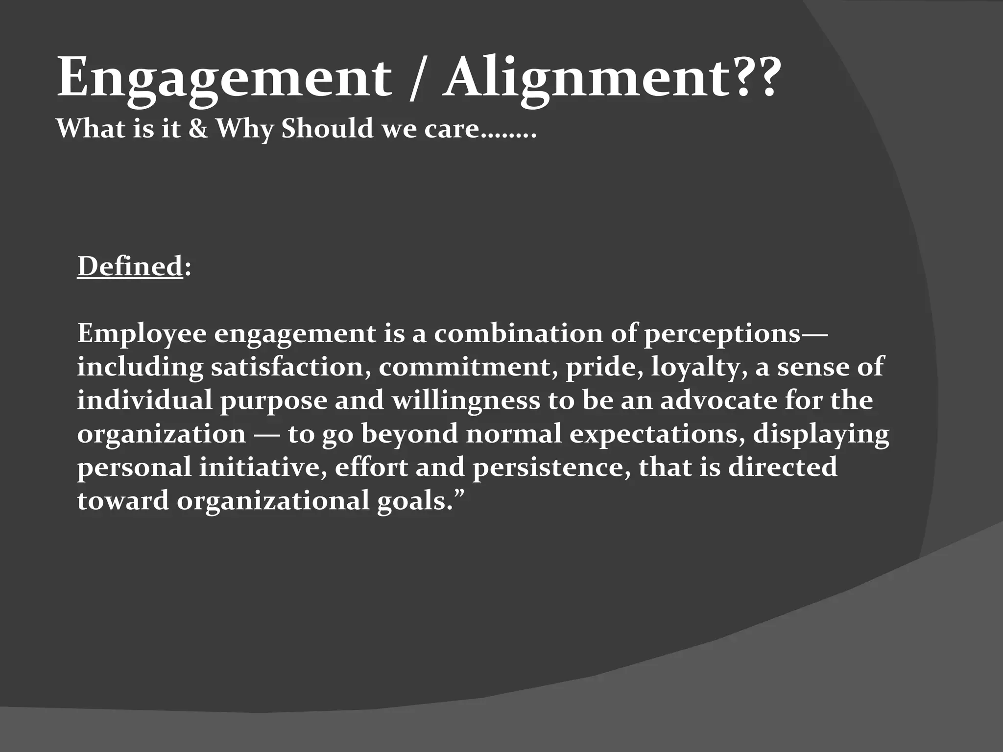The document discusses the importance of employee engagement and alignment within organizations. It defines employee engagement as a combination of perceptions including satisfaction, commitment, pride, loyalty, sense of purpose, and advocacy for the organization. The document notes that companies with high employee engagement see improved operating income while those with low engagement see declines. It also discusses how to measure engagement and alignment through diagnostics to identify areas for improvement across key business elements like strategy, people, processes, customers, leadership and culture.