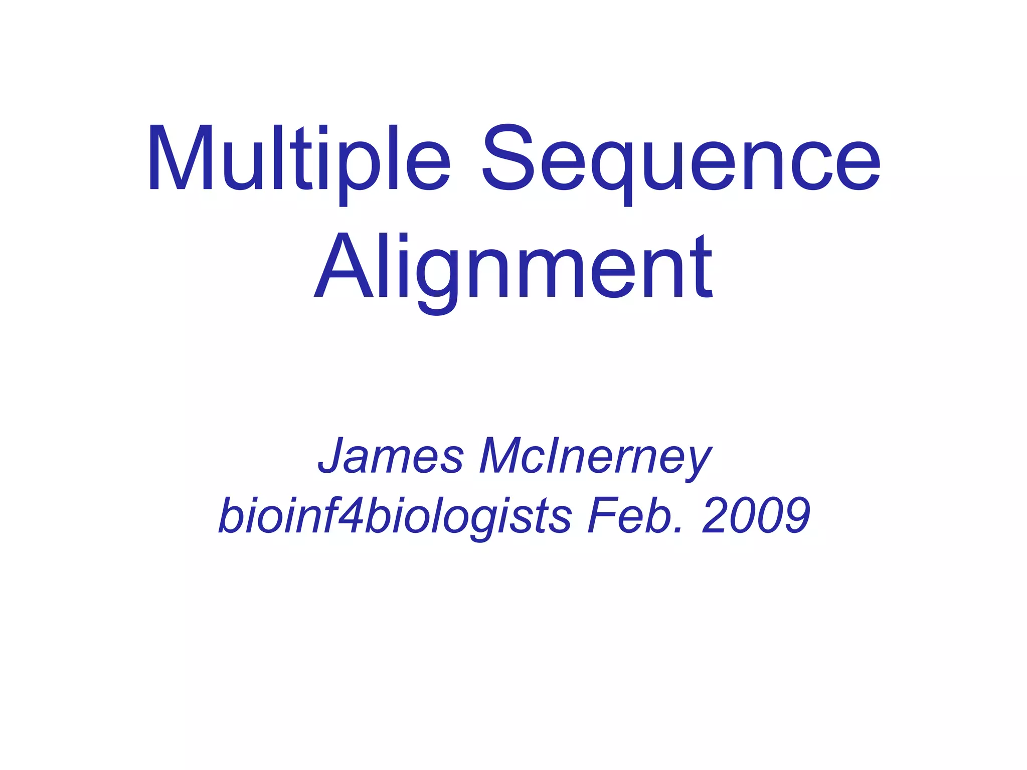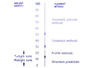 The document discusses multiple sequence alignment methods. It describes ClustalW, a commonly used progressive alignment method that first performs pairwise alignments of sequences and constructs a guide tree before progressively aligning sequences based on the tree. ClustalW is fast but has limitations as it is a heuristic that may not find the optimal alignment and provides no way to quantify alignment accuracy.