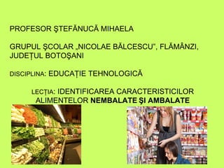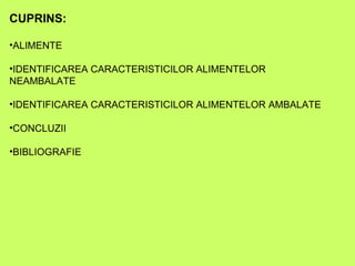 Documentul abordează identificarea caracteristicilor alimentelor ambalate și neambalate, evaluând aspecte precum proprietățile organoleptice. Se subliniază importanța siguranței alimentare și a înțelegerii etichetării produselor pentru a proteja sănătatea consumatorilor. Concluziile evidențiază necesitatea discernământului în alegerea alimentelor, pentru a evita riscurile alimentare.