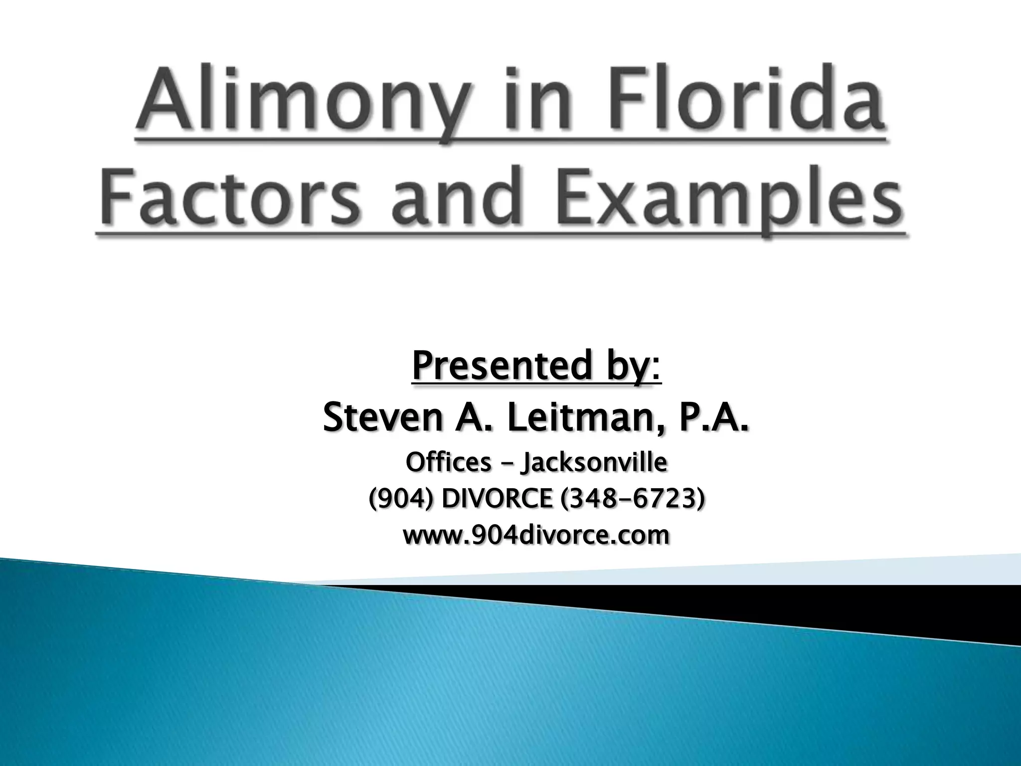 The document discusses the factors used to determine alimony in Florida according to Florida law. It examines 13 factors that courts will consider, including the standard of living during the marriage, the duration of the marriage, the age and health of the parties, the financial resources and earning potentials of both parties, contributions to the marriage such as homemaking, the responsibilities for children, tax treatment of alimony, all sources of income, and any other factors required for equity. Courts aim to use these criteria to properly evaluate each case and decide what constitutes a fair alimony award.