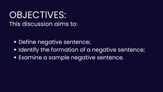 The document defines negative sentences and discusses their formation and examples. It begins by defining a negative sentence as one that indicates something is not happening, no longer exists, or does not have a particular quality. It then discusses the main ways to form negative sentences, including using words like "not", changing verbs to their negative forms, and using words like "no", "none", etc. The document also discusses understatement as a form of negative sentence through litotes, providing literary examples. It concludes by checking the reader's understanding of litotes through example negative sentences.
