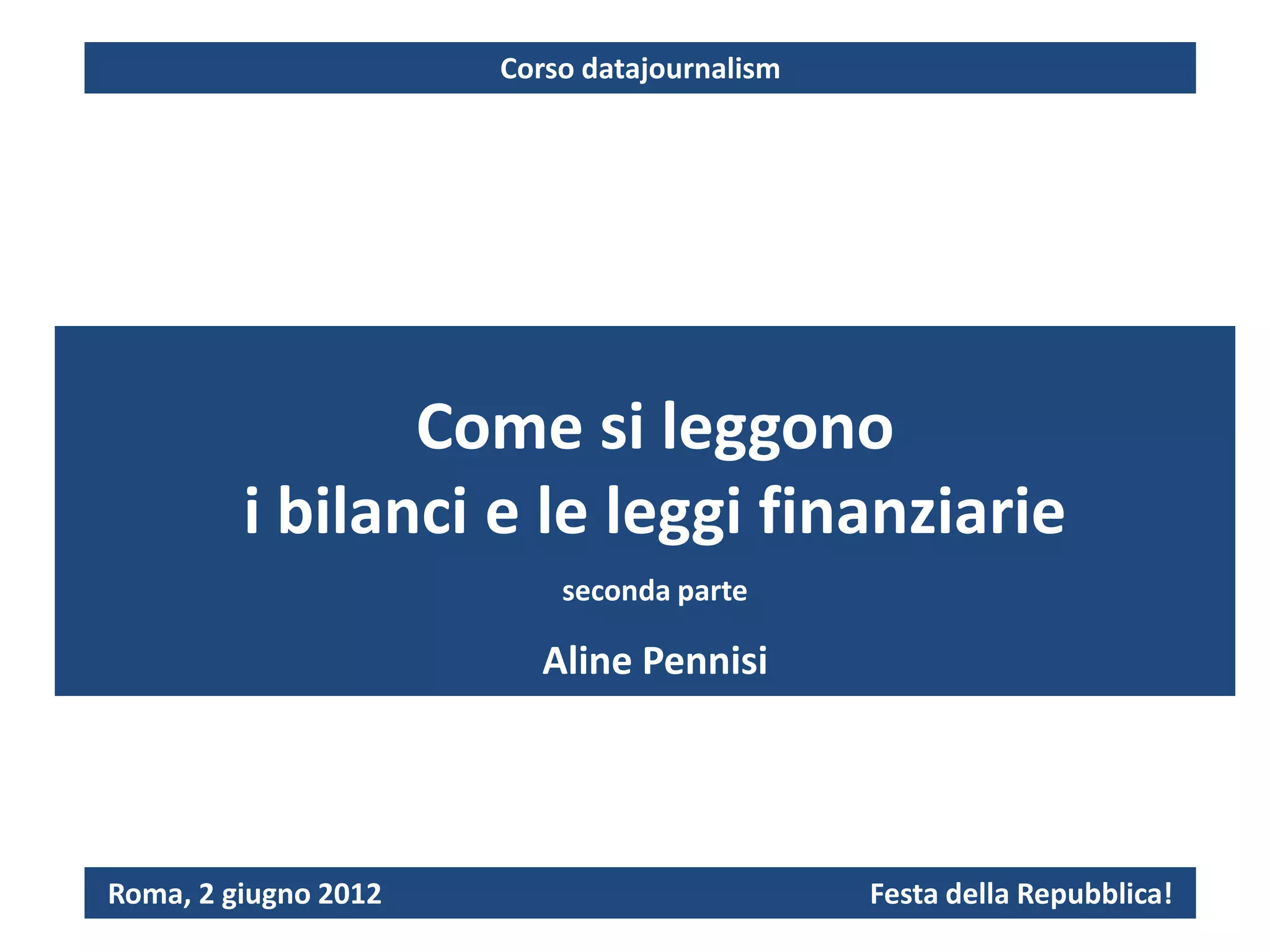 Il documento presenta un corso di datajournalism incentrato sull'analisi dei bilanci pubblici e delle leggi finanziarie in Italia. Vengono esplorate le fonti di dati disponibili, le metodologie per interpretare e visualizzare i dati finanziari, e si discutono varie iniziative per migliorare la trasparenza nelle finanze pubbliche. La lezione si concentra inoltre su come i cittadini possono accedere e comprendere queste informazioni attraverso strumenti di open data.
