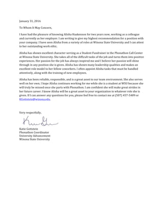 This letter provides a recommendation for Alisha Haakenson for a position with the recipient's company. The letter details that the author has known Alisha for two years as a colleague and current employer at Winona State University. Alisha has shown an outstanding work ethic and excellent character in her role as a student fundraiser in the university's phonathon call center, taking on difficult tasks positively and inspiring others with her passion. Alisha has demonstrated strong leadership qualities and is a reliable, responsible employee who serves as a great role model and asset to her team.