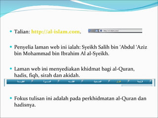 Laman web Kementerian Hal Ehwal Islam Arab Saudi menyediakan perkhidmatan berkaitan al-Quran dan hadis dengan pelbagai sumber termasuk teks, tafsir, dan terjemahan al-Quran, serta matan dan syarah hadis dari kitab-kitab terkenal. Bahagian al-Quran menawarkan enjin pencari, tafsir dari 4 sumber, dan hukum tajwid, manakala bahagian hadis menyediakan perkhidmatan serupa untuk 9 kitab hadis. Laman ini juga mengandungi khidmat kajian dan rakaman audio berkaitan hadis.