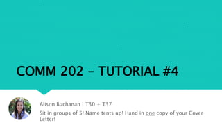 This document provides an agenda and instructions for a tutorial on cover letters and resumes. It includes a peer review of cover letters, an overview of resume formatting, and a discussion of accomplishment statements. Students are instructed to work in groups of 5 and submit one copy of their cover letter. The agenda covers cover letter and resume formatting, skills matching in cover letters, and branding in applications. Students are asked to identify the strongest application and areas for improvement. Resume writing tips emphasize accomplishment statements over duty-based descriptions and using consistent formatting.