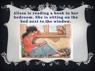 The document describes a story about a girl named Alissa who is in a difficult living situation and is working in a clothes shop. Alissa's circumstances change when a kind tall lady offers her a chance to live in her house and go to school after Alissa's act of kindness in returning a lost purse. The document explores themes of struggle, kindness, and opportunity.