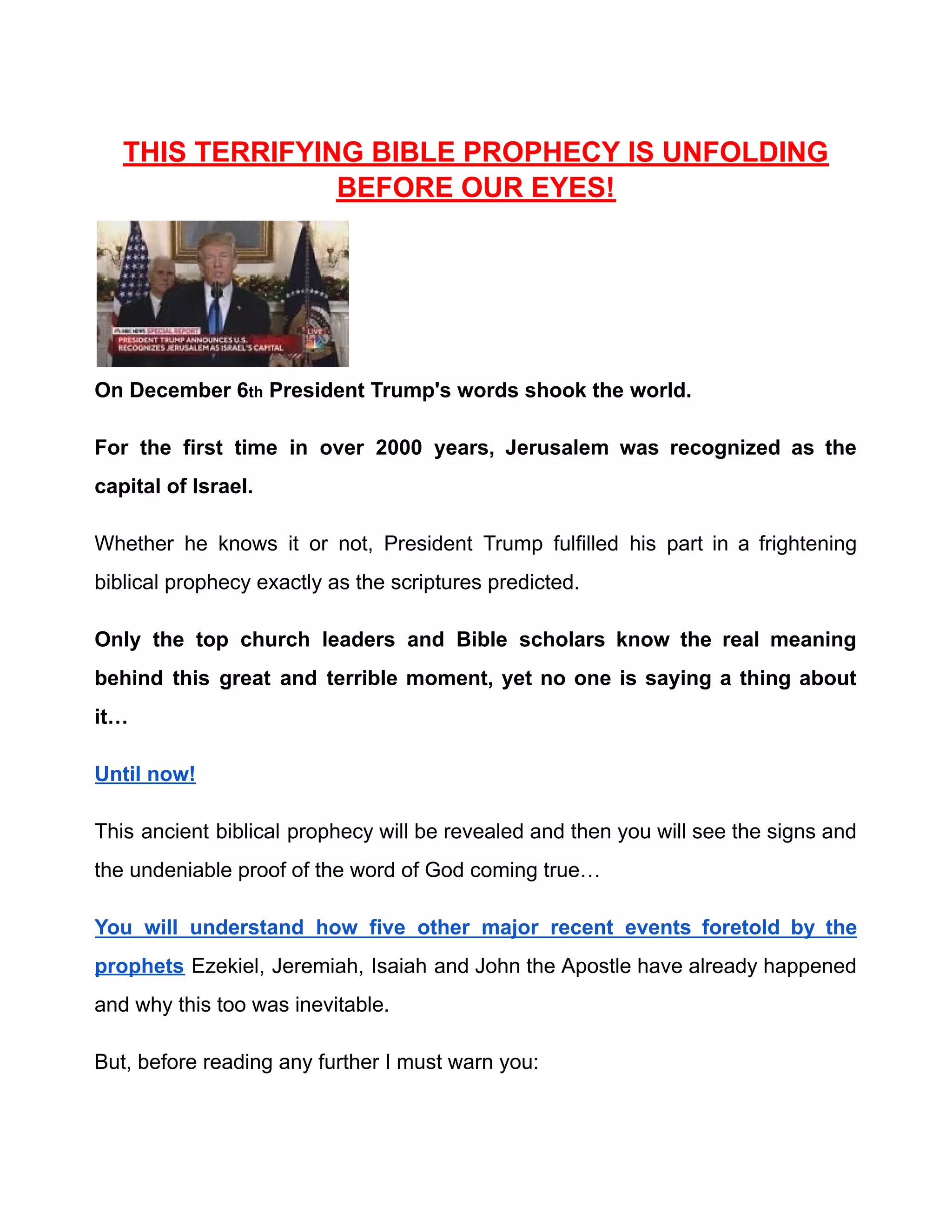 The document outlines a frightening interpretation of biblical prophecies that are believed to be unfolding in current events, particularly focusing on President Trump's recognition of Jerusalem as Israel's capital and the implications of various prophecies from Ezekiel, Isaiah, and Jeremiah. It connects the ongoing Syrian civil war, the alliance of Russia, Iran, and Turkey, and potential future conflicts with the assassination of Syrian President Bashar al-Assad. The author warns of impending tribulations and a possible World War III, underscoring the importance of understanding these biblical predictions in the context of modern geopolitics.
