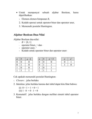 Dokumen ini membahas aljabar boolean, dengan dua operator biner (+ dan ⋅) dan satu operator uner ('). Aljabar boolean dua-nilai dijelaskan serta postulat Huntington diperlihatkan, termasuk cara mengevaluasi dan memanipulasi ekspresi boolean. Hukum-hukum aljabar boolean juga dirangkum, mencakup hukum identitas, komutatif, dan hukum De Morgan.