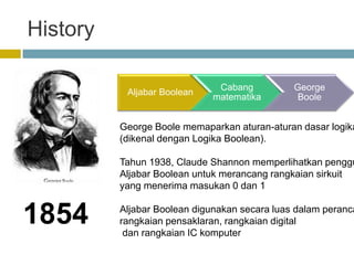 Dokumen ini membahas aljabar boolean yang ditemukan oleh George Boole dan aplikasinya dalam perancangan sirkuit digital. Terdapat penjelasan mengenai hukum-hukum aljabar boolean serta sifat universal dari gerbang logika NOR dan NAND. Selain itu, dokumen ini juga memberikan contoh bagaimana menyusun rangkaian logika menggunakan hanya gerbang NAND.