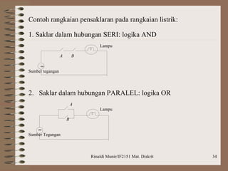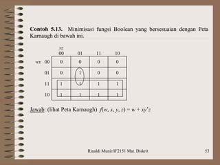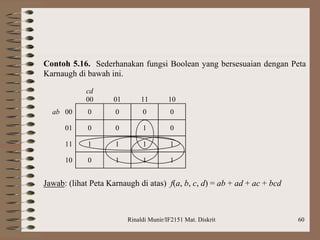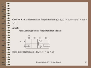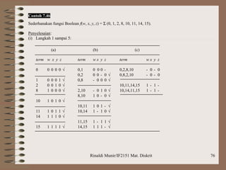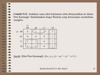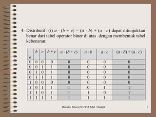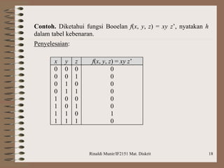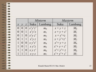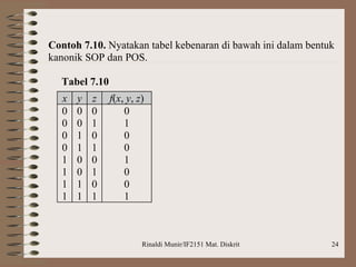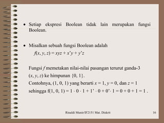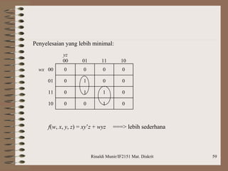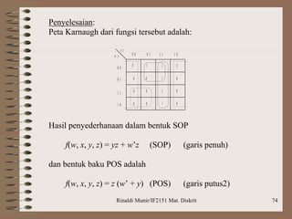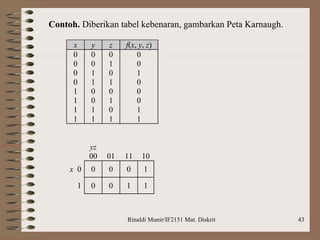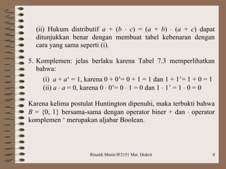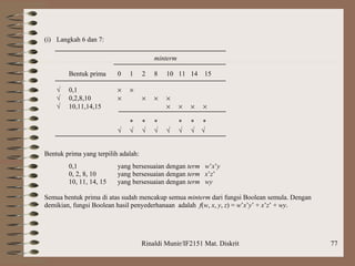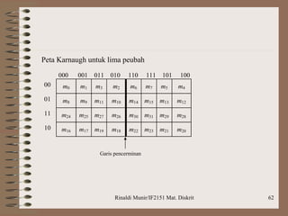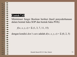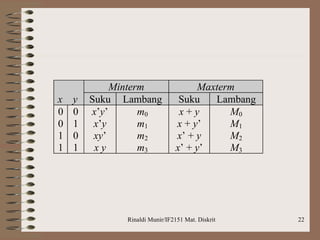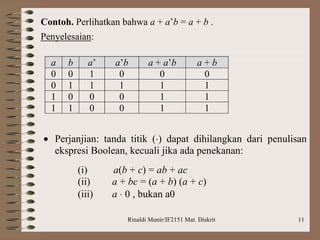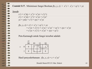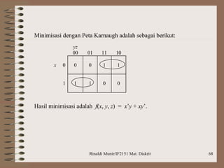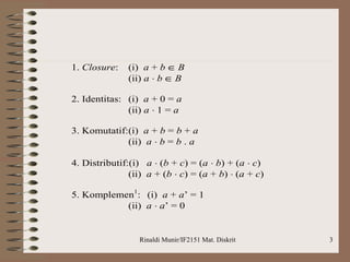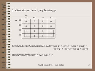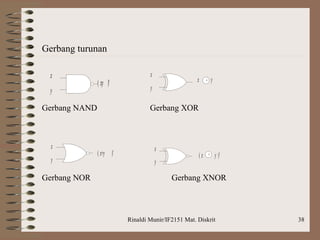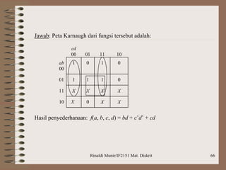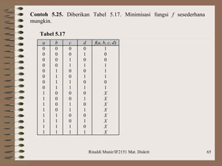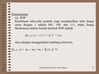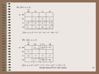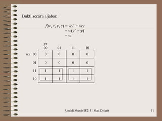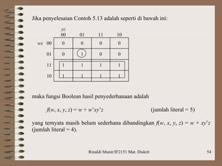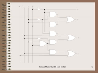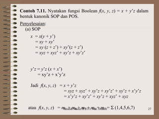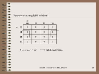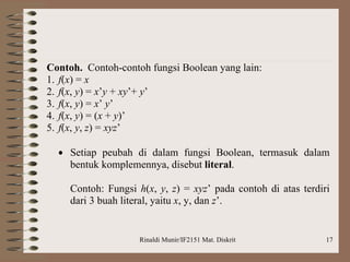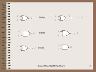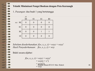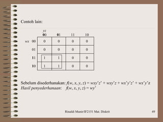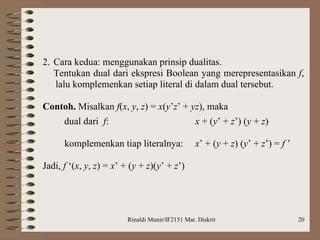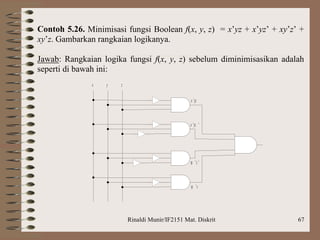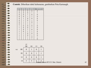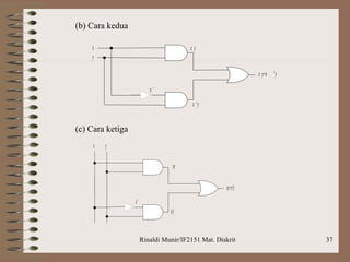 Dokumen ini membahas aljabar boolean, termasuk definisi, operasi, dan postulat yang harus dipenuhi untuk aljabar boolean. Selain itu, dijelaskan tentang penyederhanaan fungsi boolean dengan metode seperti peta Karnaugh dan Quine-McCluskey, serta latihan soal penerapan logika untuk mengimplementasikan rangkaian. Contoh yang diberikan mencakup penggunaan gerbang NAND untuk merancang logika berdasarkan ekspresi dan perbandingan bilangan biner.