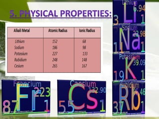 Alkali metals have a single outer electron, making them highly reactive and electropositive. They are never found naturally in their elemental forms, instead occurring as oxides, halides, borates, silicates, and nitrates. Alkali metals increase in size down the group and have low ionization energies, with lithium being the smallest and most reactive and cesium being the largest and least reactive. They react vigorously with air, water, halogens, and dihydrogen to form ionic compounds. Common uses include softening hard water, manufacturing glass, detergents, and as reducing agents.