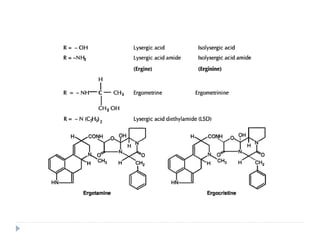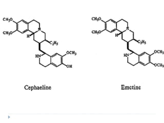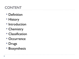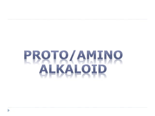 This document provides information about alkaloids. It begins with definitions and classifications of alkaloids. It then discusses two specific alkaloids - ephedra and colchicum. For ephedra, it describes the plant source, chemical constituents including ephedrine, uses, and chemical tests. For colchicum, it provides the plant source, chemical constituents including colchicine, and geographical sources.