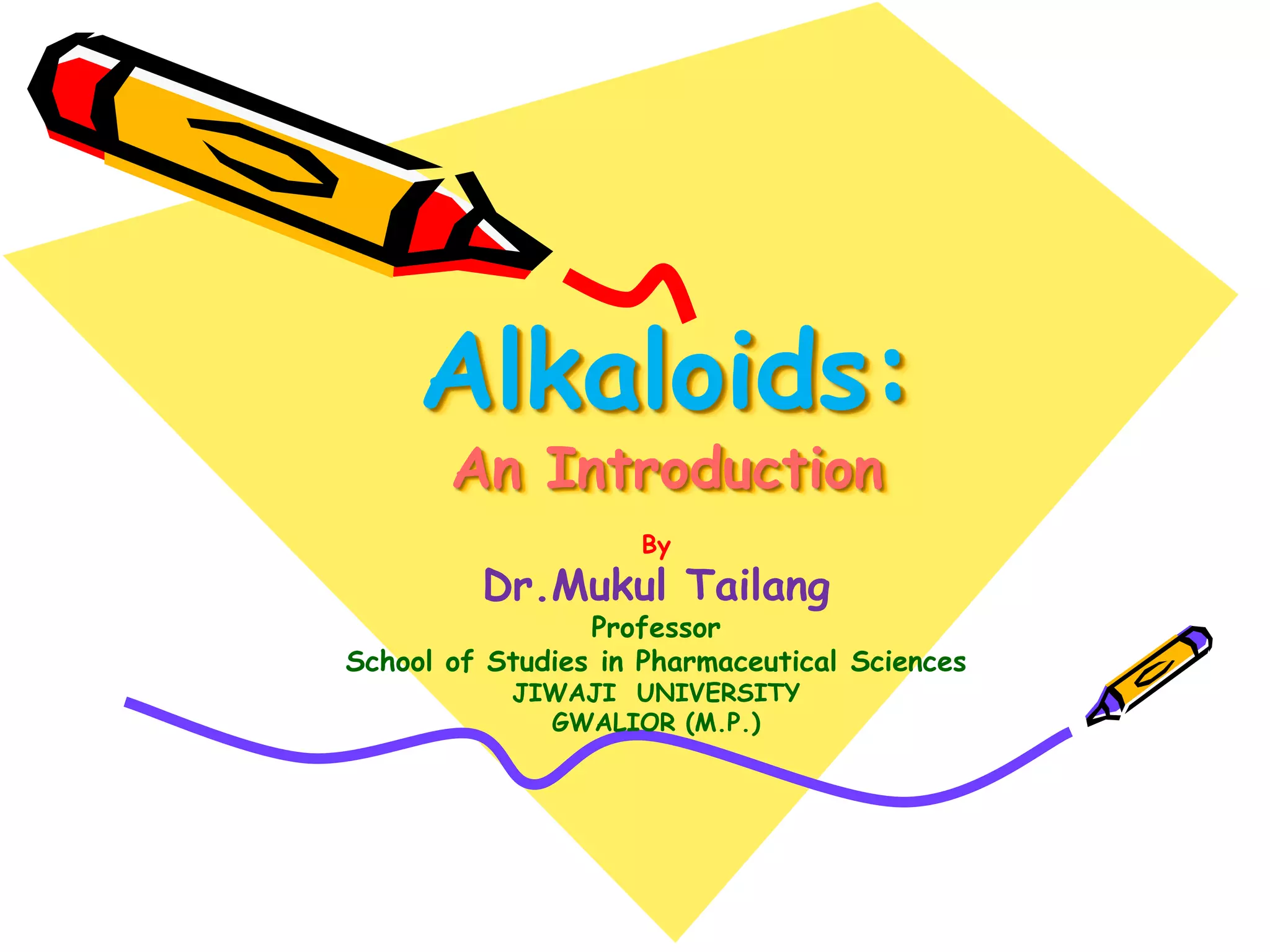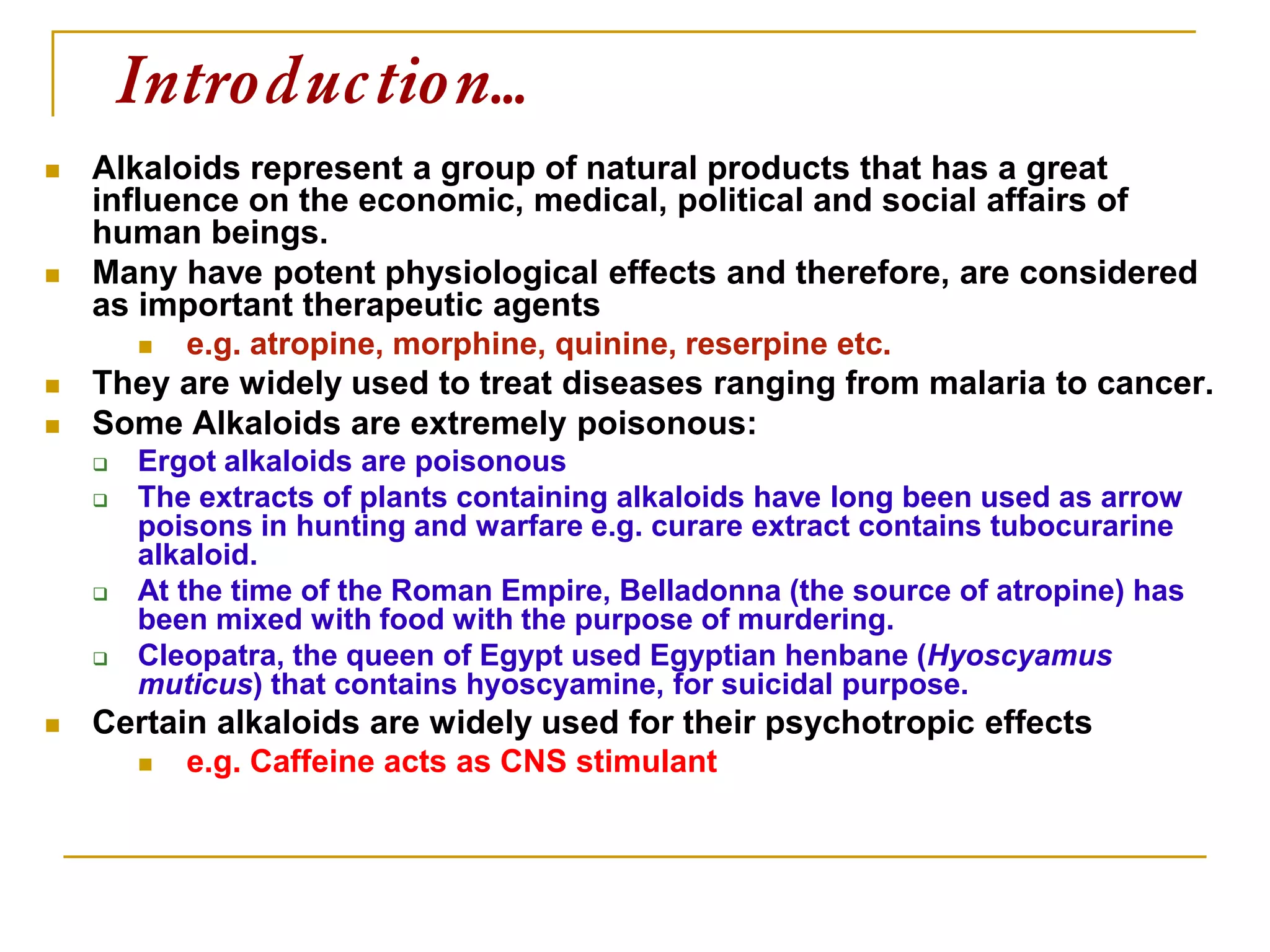 Alkaloids are basic, nitrogen-containing compounds found in plants that have significant pharmacological effects. They have complex molecular structures with nitrogen in a heterocyclic ring. Many alkaloids have potent physiological effects and are used as important therapeutic agents to treat diseases. However, some alkaloids like ergot alkaloids are also highly poisonous. Alkaloids exhibit a wide range of pharmacological activities and can be used as analgesics, stimulants, anticancer agents, and to treat various other conditions.