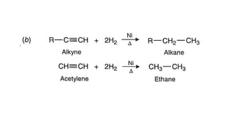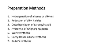 Alkanes can be prepared through several methods including hydrogenation of alkenes/alkynes, reduction of alkyl halides, decarboxylation of carboxylic acids, hydrolysis of Grignard reagents, and Wurtz, Corey-House, and Kolbe syntheses. Alkanes are nonpolar, colorless liquids or solids that are stable under normal conditions but undergo substitution and thermal/catalytic reactions. Substitution reactions include halogenation, nitration, and sulfonation, while thermal reactions include combustion, pyrolysis, isomerization, and aromatization.