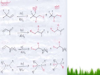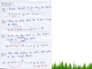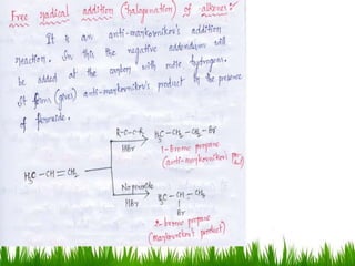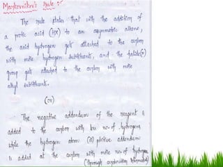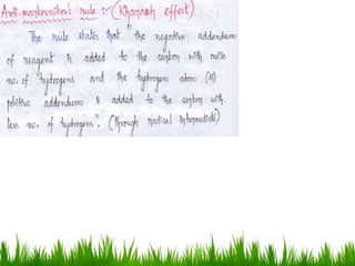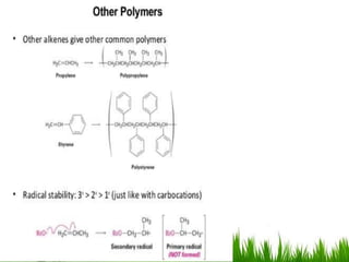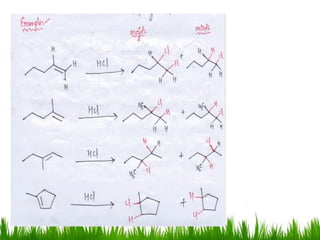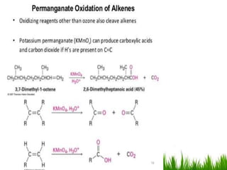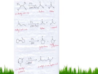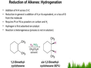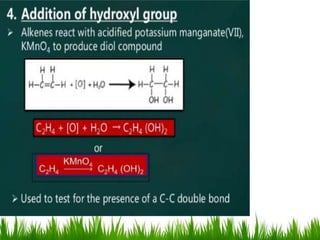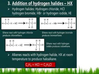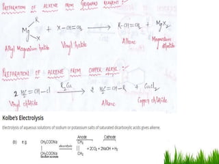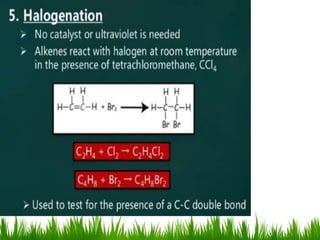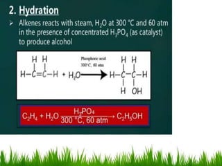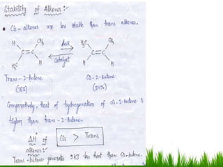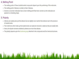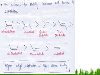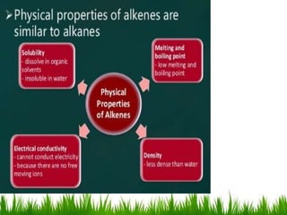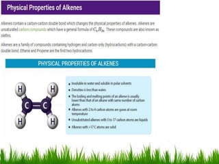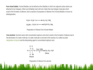 Alkenes are unsaturated hydrocarbons containing at least one carbon-carbon double bond. They have the general formula CnH2n. Common examples include ethylene (C2H4). Alkenes are prepared through ozonolysis and by following Saytzeff's rule. They have a variety of uses.