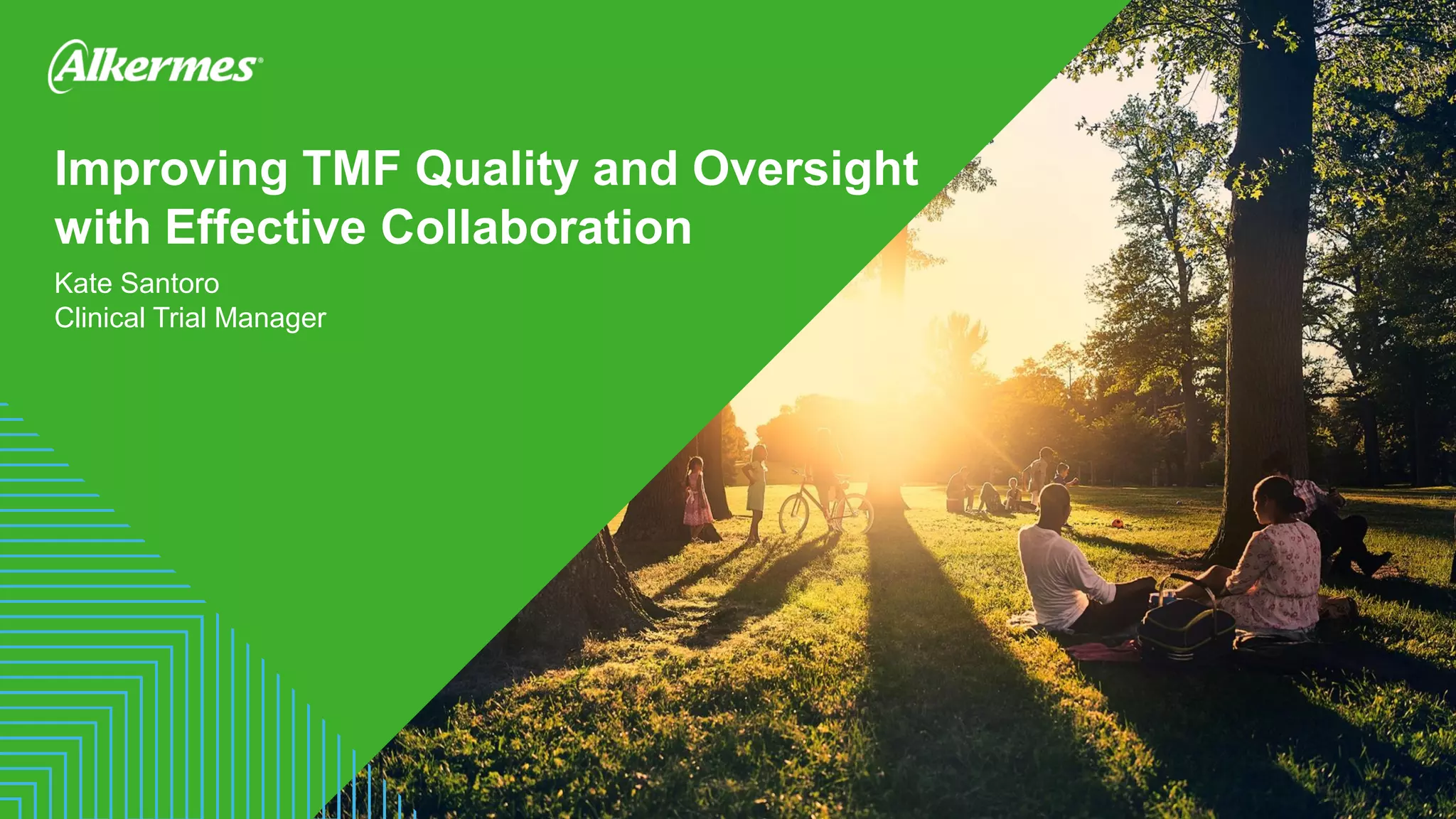 Kate Santoro from Alkermes presented on their experience improving TMF quality and oversight through effective collaboration with CROs on their Veeva eTMF system. Key aspects of their process included getting CRO input during system configuration, training CRO and sponsor users together, aligning processes during implementation, and holding periodic check-ins and TMF summits with internal and CRO stakeholders to review metrics and identify areas for improvement. The goal was to drive better sponsor oversight through collaborative working relationships with CROs.