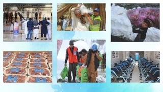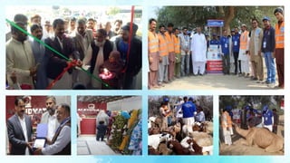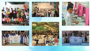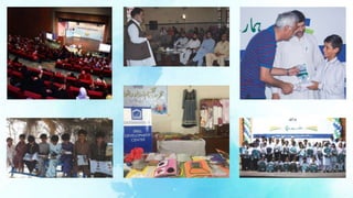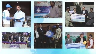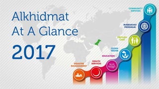 Alkhidmat provided services to over 9.7 million beneficiaries in 2017 through its various programs. Key programs included disaster relief to over 257,000 people, health services to 6.7 million through hospitals, clinics and medical camps, education services to over 20,000 through schools and scholarships, clean water access to 1.7 million people through water projects, orphan support to over 10,000 orphans, microfinance to over 4,400 through its Mawakhat program, and various community services including food/winter aid to over 953,000 people. Alkhidmat operates regionally across Pakistan and has international aid activities as well, utilizing over 150 offices and 19 hospitals.