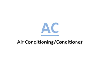 This document discusses types of air conditioners, factors to consider when choosing an AC unit, and AC components. It explains that window units and split units are common types, and that the cooling capacity in tons depends on room size. It also notes that more energy efficient inverter ACs and copper condenser coils are better options, and that installation, service, and after-sales support should be considered.