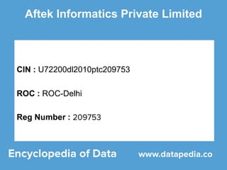 Aftek Informatics Private Limited is a company registered in New Delhi, India, with a corporate identification number and a date of incorporation that indicates it was established in 2010. The company's directors are Sandhya Kumar and Rakesh Kumar. The document provides basic company information including its registered address and capital details.