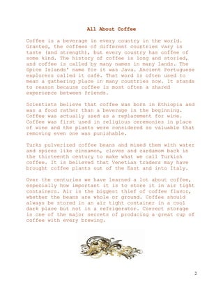 This document explores various aspects of coffee, including its history, types, and brewing methods. It offers tips for storing coffee, brewing techniques, and suggestions for enhancing flavor, as well as recommendations for espresso machines. Additionally, it provides recipes for specialty coffee drinks, emphasizing how to recreate café-quality beverages at home.
