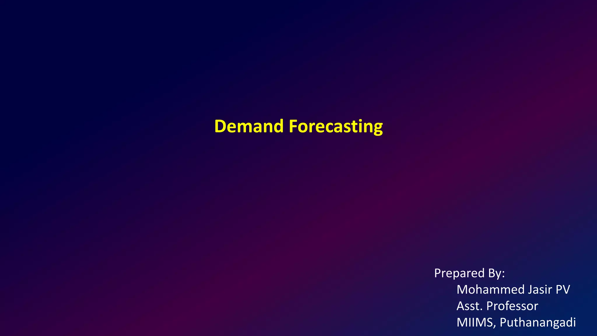 The document discusses demand forecasting techniques. It defines demand forecasting as estimating probable future demand using historical sales data. Accurate forecasting is important for business planning activities like production, marketing, finance, etc. The document outlines qualitative methods like executive opinion and quantitative methods like simple average, moving averages, regression analysis. It provides examples of calculating forecasts using different techniques and discusses using regression analysis to identify impactful variables.