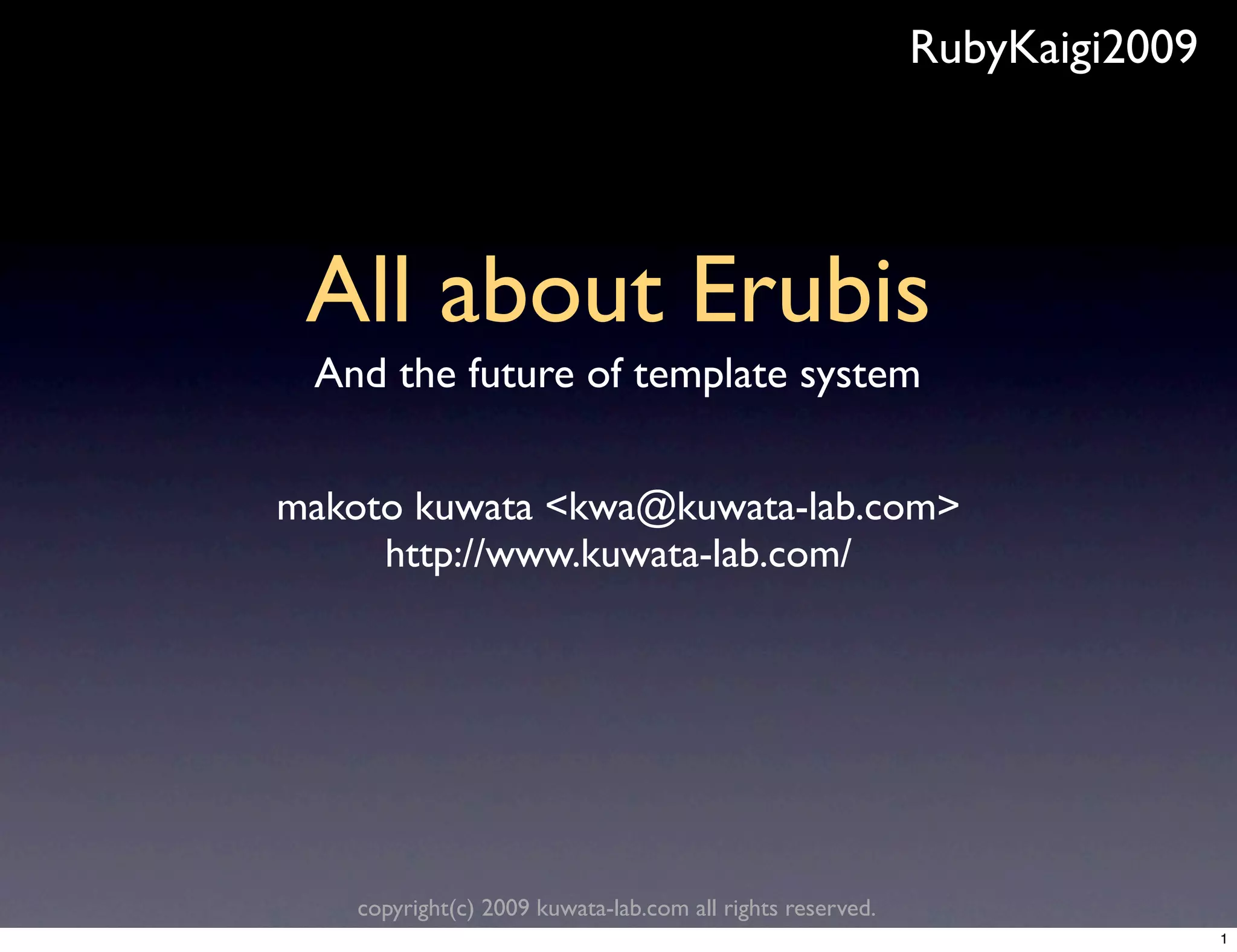 The document presents an overview of Erubis, a Ruby template system, highlighting its features, advantages over Eruby, and solutions to common issues. Key features include fast execution, HTML escaping, support for various programming languages, and customizable enhancements. The document also addresses problems related to variable scoping, conversion costs, and syntax error detection, providing specific solutions implemented in Erubis.