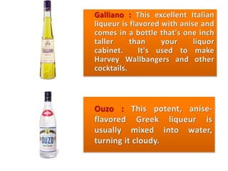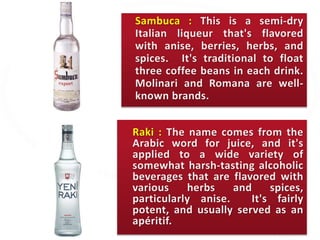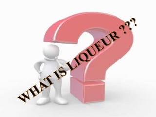 The document discusses liqueurs and provides details on their production and types. It defines liqueurs as sweet alcoholic beverages made from spirits flavored with fruits, herbs, spices or other ingredients and bottled with added sugar. It describes the main types of liqueurs such as chocolate, cream, fruit, herbal and bitters liqueurs. It provides popular brand examples for each type and explains the basic process of making liqueurs through infusion, filtering, adding sweeteners and aging.