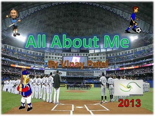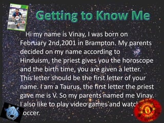 Vinay was born on February 2nd, 2001 in Brampton, Ontario. His parents named him Vinay based on his horoscope from Hinduism, which indicated his name should start with the letter V. He enjoys playing video games, watching soccer, and playing sports like baseball with his friends. Some of his goals are to participate more in class, learn more about technology, travel the world, and improve at baseball. Family and friends are also very important to him.