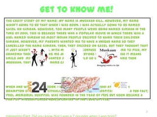 Muskaan Gill provides biographical information about herself, including how she got her name, where and when she was born, her horoscope sign and birthstone. She describes her family members and best friends. Muskaan discusses her past birthdays and plans for future birthdays. She shares her career and life goals, as well as expectations for future technology, space exploration, environmental and social issues. Muskaan also indicates which cartoon character she relates to based on an online test and lists some of her favorite hobbies.