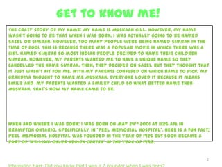 Muskaan Gill was born on May 24, 2001 in Brampton, Ontario. Her name was originally going to be Sazel or Simran but her parents chose Muskaan instead because it means "smile" and they wanted a smiley child. She enjoys celebrating Diwali with her family by lighting fireworks, eating sweets and dinner together. For future birthdays, she hopes to have a swimming party, piñatas, or go to an arcade like Playdium.